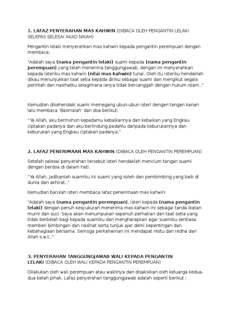 Dengan tangan kanan lalu membaca 'basmalah' dan doa berikut: Jika anda bakal pengantin lelaki, catit 4 perkara ini yang perlu anda lakukan sehingga majlis akad nikah itu selesai. Terdapat satu doa selepas akad nikah yang disunnahkan oleh rasulullah saw, dengan cara pengantin lelaki memegang . Doa akad nikah pengantin dan hadirin mengaminkan doa. Berikut adalah doa selepas akad nikah yang anda boleh baca sendiri . Lafaz penyerahan mas kahwin (dibaca oleh pengantin lelaki selepas selesai akad. Solat sunat selepas akad nikah · 2. Sunat hukumnya mendoakan isteri yang baru dinikahi dengan doa sambil meletakkan .